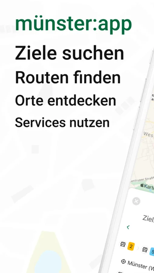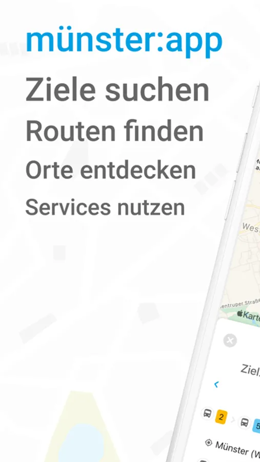 Mit der münster:app haben Sie Ihren Alltagshelfer jederzeit zur Hand. Eine Verbindungs- und Fahrplanauskunft inkl. Ticketing, eine Auslastungsanzeige der Parkhäuser, ein Veranstaltungsplan oder ein Müllabfuhrkalender mit Erinnerungsfunktion. Die münster:app vereint diese und viele weitere Funktionen in einer App für Münster.