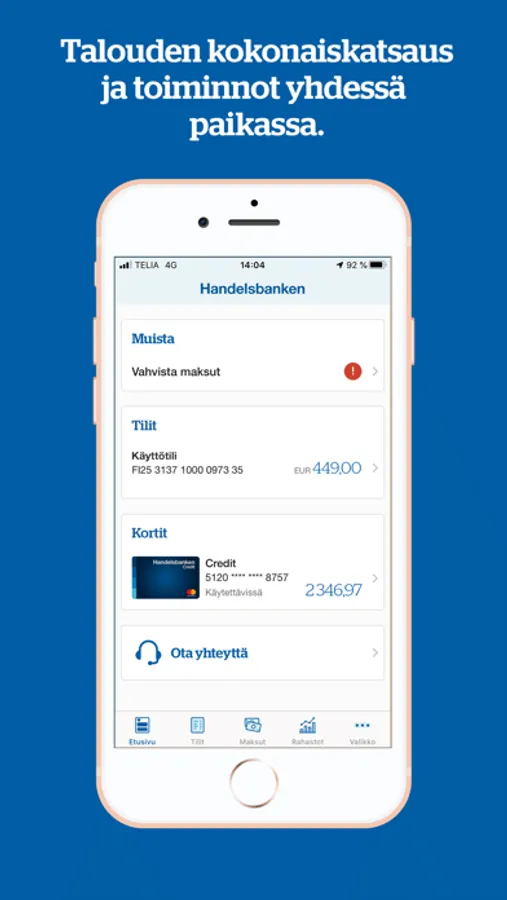 - Soittaa Handelsbankenin puhelinpalveluun tai omaan konttoriisi, josta saat henkilökohtaista palvelua