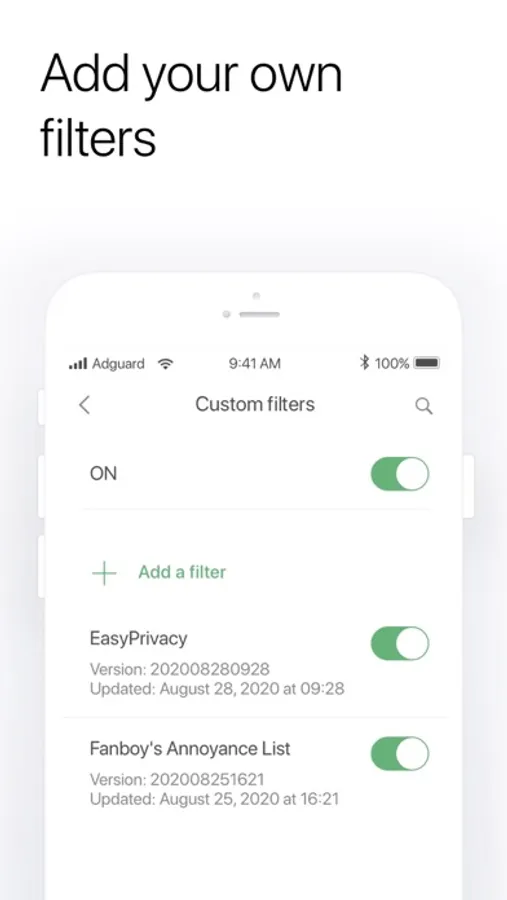 - More than 50 popular subscriptions (EasyList, EasyPrivacy, etc.) plus AdGuard's own powerful ad filters, including language-specific filters. Together they don't leave ads a chance.