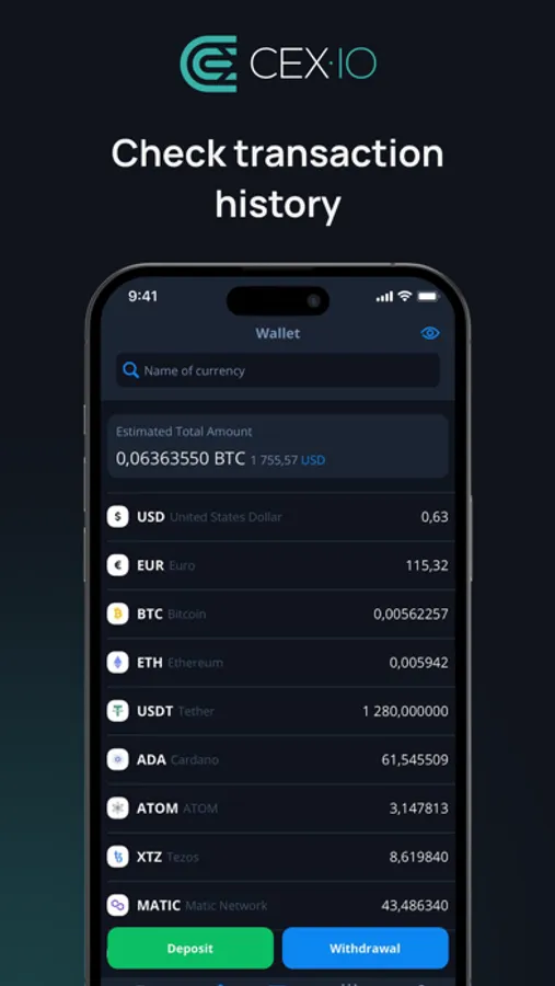 - Detailed order and transaction history. Stay informed of your crypto operations, with clear explanations of all the fees and commissions.