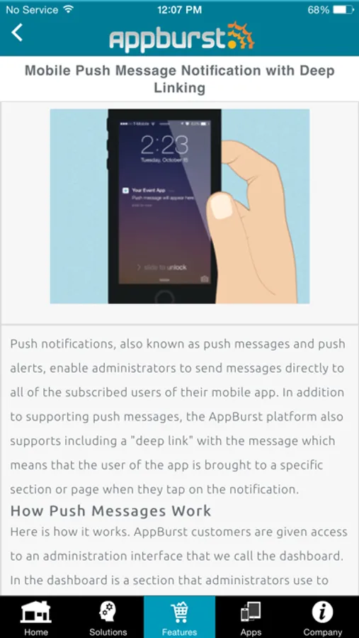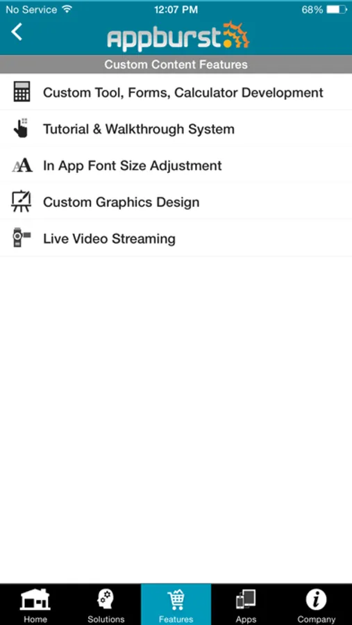 The AppBurst Mobile App educates users on aspects of developing a mobile app. Read examples of app development in various industries and overviews of available features with screenshots. Browse a complete listing of apps developed using AppBurst’s platform with links to download the apps directly from the AppStore. Frequently asked questions and informative blog posts serve to provide additional color on the development process and benefits of going mobile. Other highlights of the AppBurst Mobile App include testimonials, details on the AppBurst team, and a contact form to schedule a demo or chat with a representative about mobile app solutions tailor-made to any specific brand and goals.