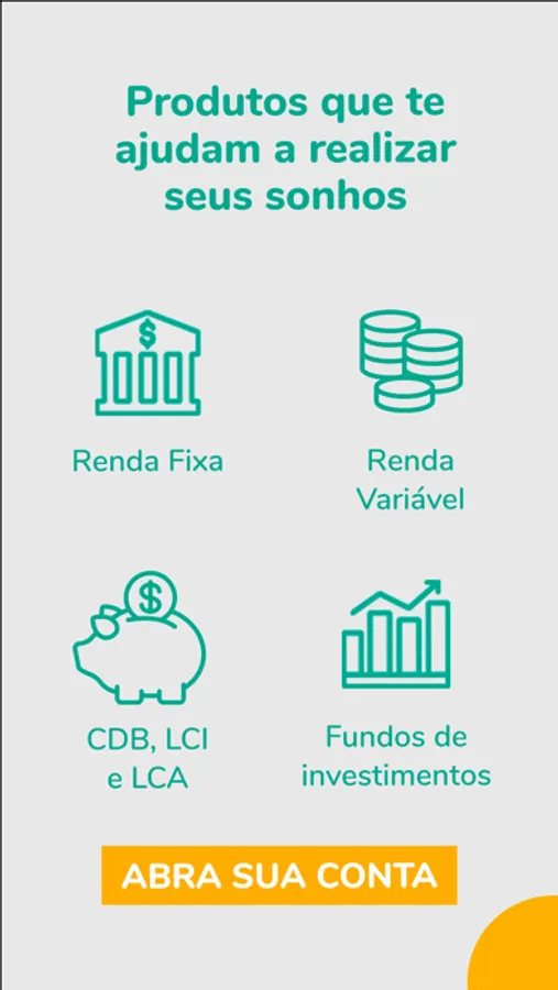 Invista em renda fixa (LCA, LCI ou CDB) e em renda variável (Ações, BDRs, FIIs e +)