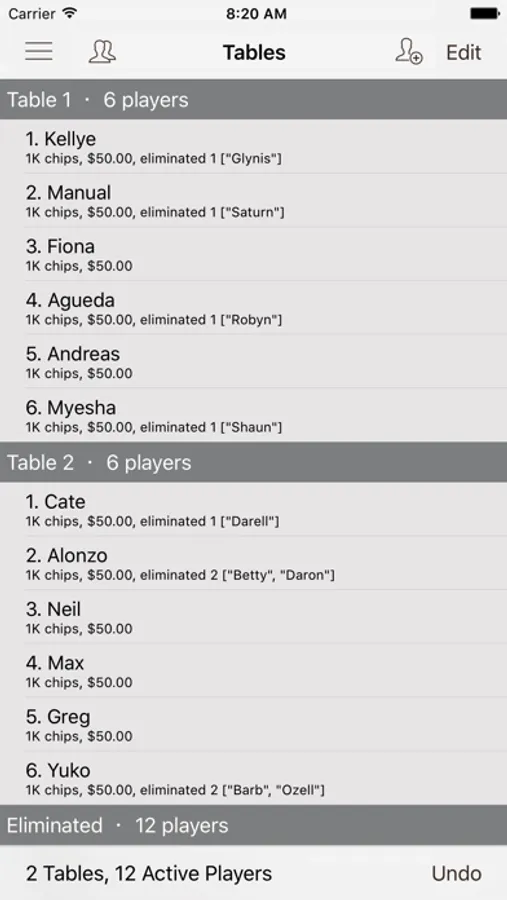 • Player and Table Management: Enter players by name and keep track of buy-ins, add-ons, and re-buys. Randomly seat players at tables. Keep track of when each player was eliminated, and by whom. Be informed when tables are out of balance and when they can be consolidated.
