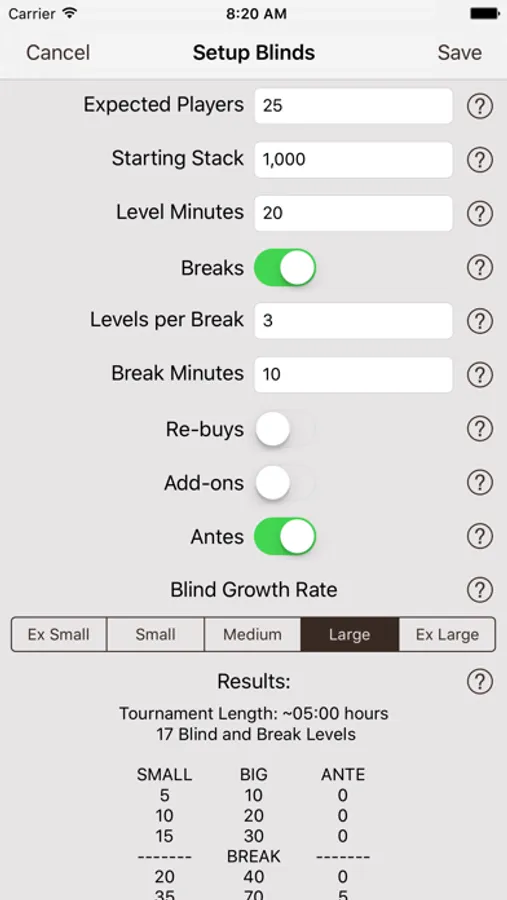 • Easy to use: Just enter the number of players and starting chips and it will create a high quality custom blinds schedule that is ready to use.