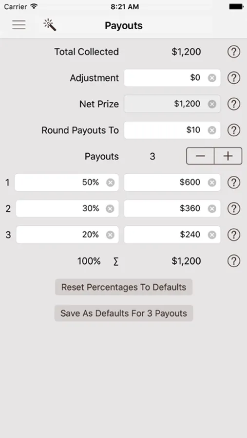 • Payout Calculator: Set the number of payouts, and adjust the percentages that go to each payout. The net prize amount is automatically calculated from buy-ins, add-ons, and re-buys, and can be adjusted to include an amount or percentage that goes to the house.