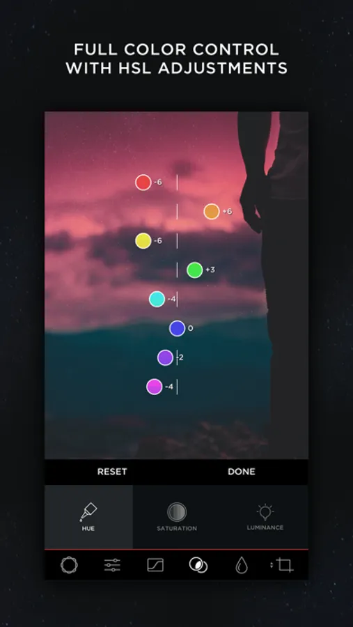 Adjust the hue, saturation, and luminance of different colors.