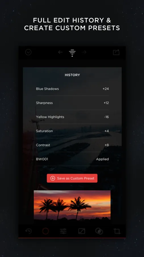 Create a custom preset from scratch, or edit existing ones to perfect the look you're after. Quickly apply them to any other photo in your library.