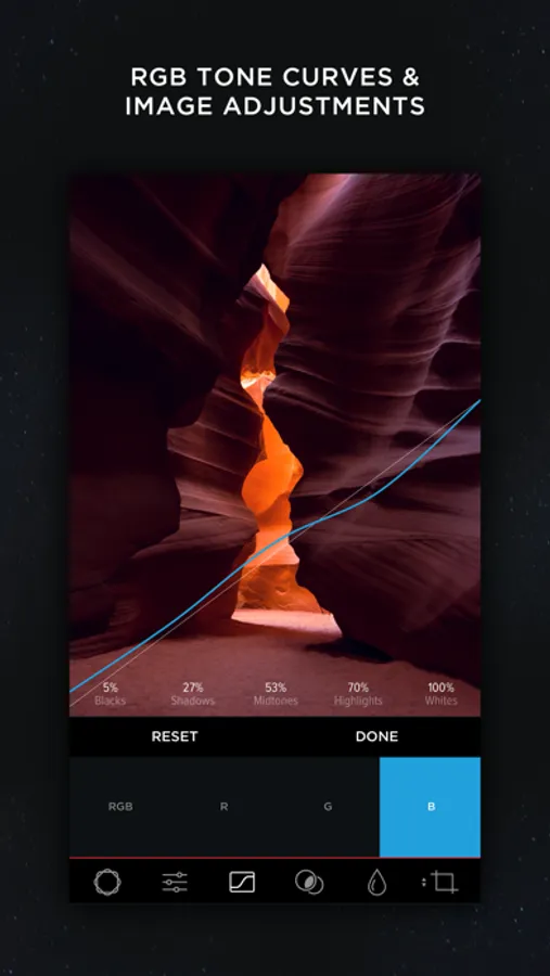 Capture the perfect tone with the Curves tool, allowing independent access to the red, green and blue color channels.