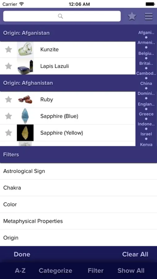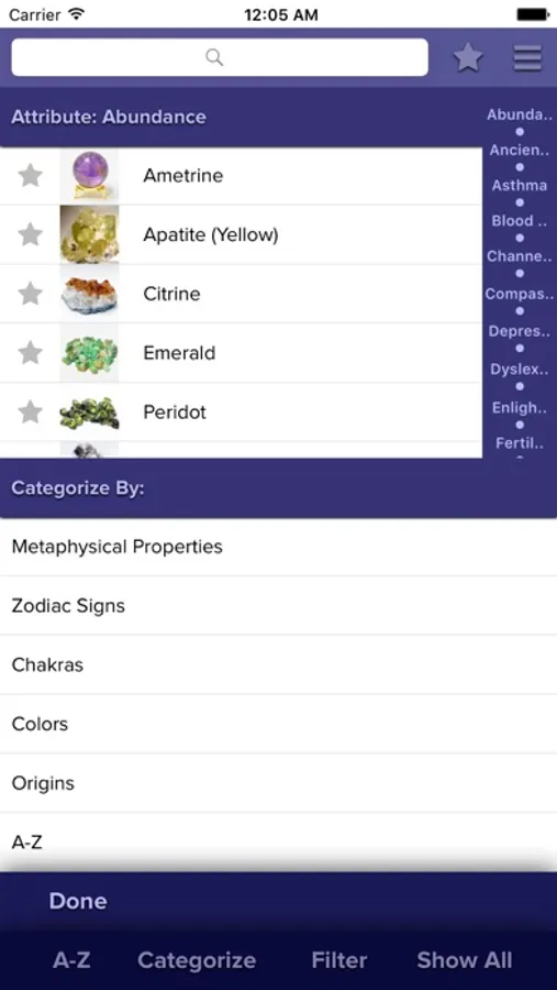 Categorize your mineral and crystal dictionary to see your crystals grouped by Chakra Correspondence, Metaphysical Properties, Colors, Origin, and Astrological Correspondence.