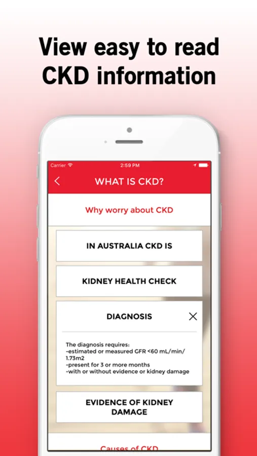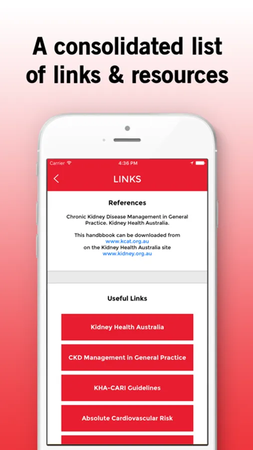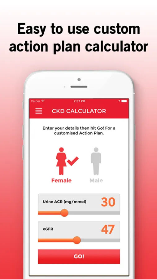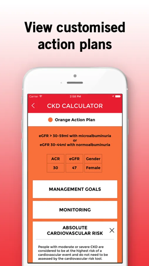 This app allows you to view a personalised action plan based on the eGFR and urine albumin:creatinine ratio. Action plans and staging criteria have been adapted from CKD Management in General Practice, Kidney Health Australia.