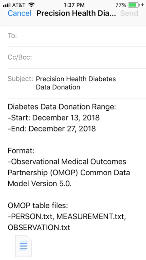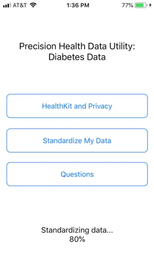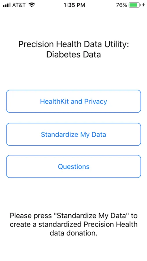 Precision Health initiatives will require research that not only uses a person’s clinical and genomic data, but their mobile health (mHealth) data as well. This app leverages HealthKit and integrates with the Health app to help Precision Health organizations build a standardized Precision Health mHealth database for Diabetes research. It is a simple utility that lets people choose baseline Health app data they wish to share, creates standardized (OMOP CDM v5.0) files that Precision Health researchers can understand, and allows them to email their donation to any Precision Health Diabetes project of their choosing. Before sharing data, users will be prompted to grant access to specific HealthKit fields relevant for Diabetes research (sex, age, vitals, results, body measurements, etc).