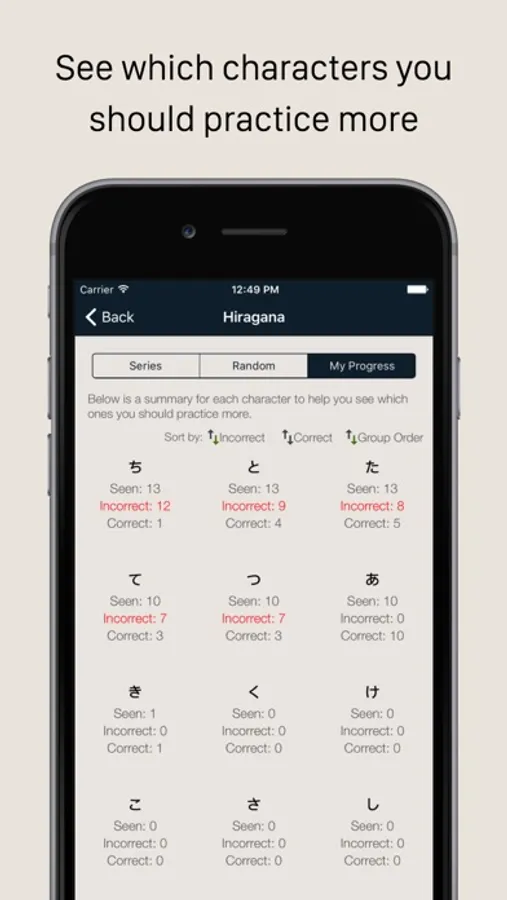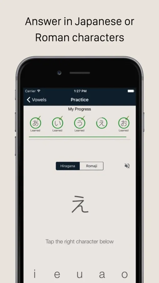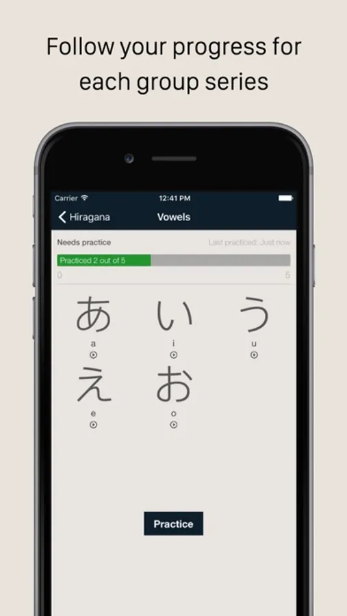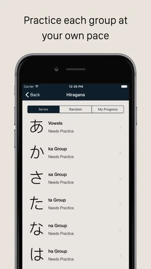 Learn the Japanese syllabaries Hiragana and Katakana with the Practice Japanese app. You will have the chance to practice each group of characters as much as you want.