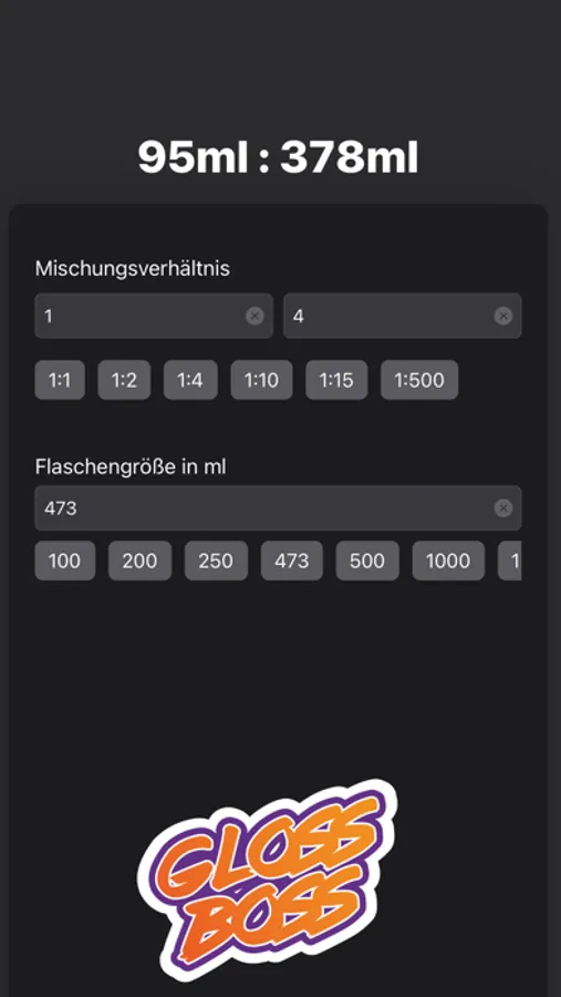 Um dir die umständliche Rechenarbeit abzunehmen, kannst du dein gewünschtes Mischungsverhältnis (z.B. 1:4, 1:25 etc.) mit dem GLOSSBOSS Mischungsrechner berechnen lassen.