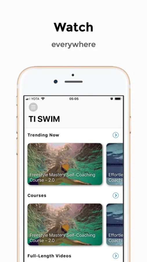 Become your own best swim coach and take charge of your improvement today! Practice anywhere on any device and enjoy unlimited access to Total Immersion programs and courses. Compatible with iPhone, iPad, and AppleTV.
