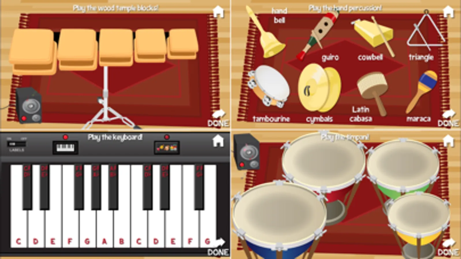 Musical instrument identification: saxophone, classical and electric guitar, french horn, trombone, tuba, drumset, piano, trumpet, xylophone, violin, flute, clarinet, hand bell, guiro, cowbell, triangle, tambourine, cymbals, Latin cabasa, maracas, accordion, harp, conga drums, snare drums, wood temple blocks, banjo, bagpipes, harmonica, and timpani drums.