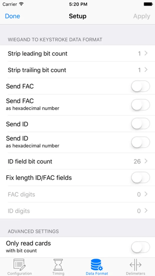 Setup output format between decimal and HEX, control Wiegand bits output format, strip leading and trailing bits, enable/disable FAC (Facility Access Code), Reverse / Invert Wiegand bits, and more.