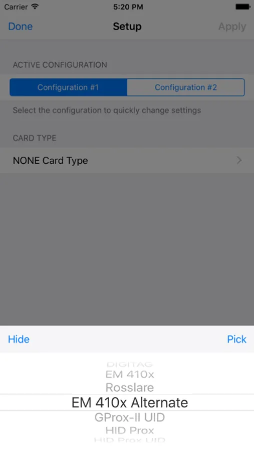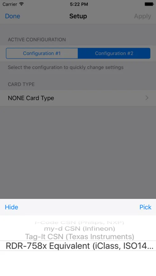 Select card type for ISO15693 & ISO14444A CSN, iClass CSN, Tag-It CSN, my-d CSN (Infineon), I-Code CSN (Philips, NXP), etag CSN (Secura Key), MiFare Ultralight CSN (Philips, NXP), I-tag CSN (IBM), DESFire CSN, Advant CSN (Legic), HID iClass ID, Secura Key -01, ReadyKey Pro UID, Radio Key (Secura Key -02), Nexwatch (Honeywell), NexKey, Quadrakey, KeyMate, 2Smart Key (Honeywell), Keri UID, Pyramid (Farpointe Data) PSC-1 26 Bit, Keri PSC-1 26 bit, Farpointe Data (Pyramid) PSC-1 26 bit, Keri NXT UID, ioProx (Kantech), Indala ECR Custom, Indala ASP+ Custom, Indala ASP+ UID (Motorola), Indala ASP Custom, Indala ASP UID (Motorola), Indala ASP 26 bit (Motorola), ID Teck, HiTag 2, HiTag 2 Alternate, HiTag 1 & S, HiTag 1 & S Alternate, HID Prox UID, HID Prox, GProx-II UID, EM 410x Alternate, Rosslare, EM 410x, DIGITAG, Paradox, CDVI, CASI-RUSCO (GE Security, UTC), Russwin UID, Cardax UID, Awid
