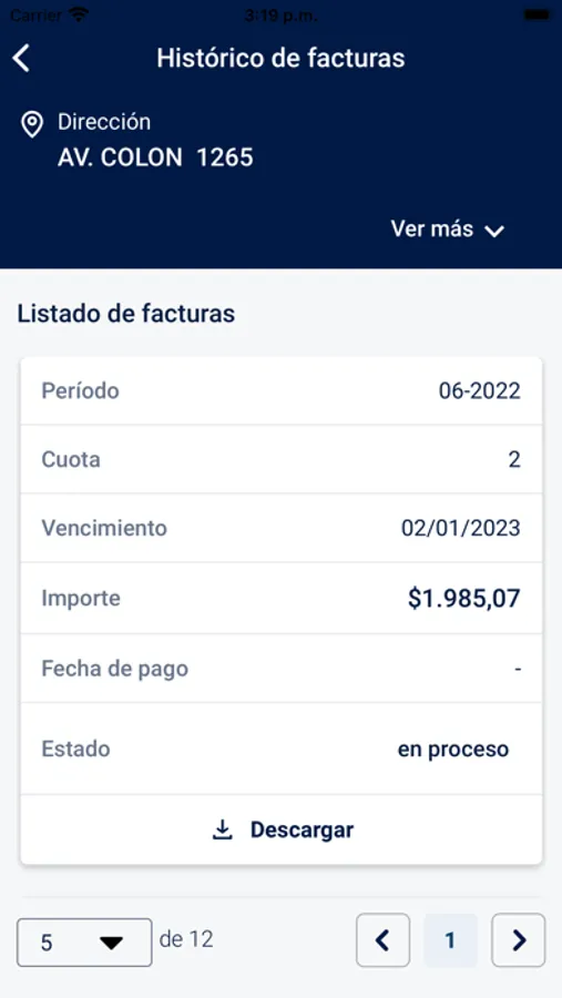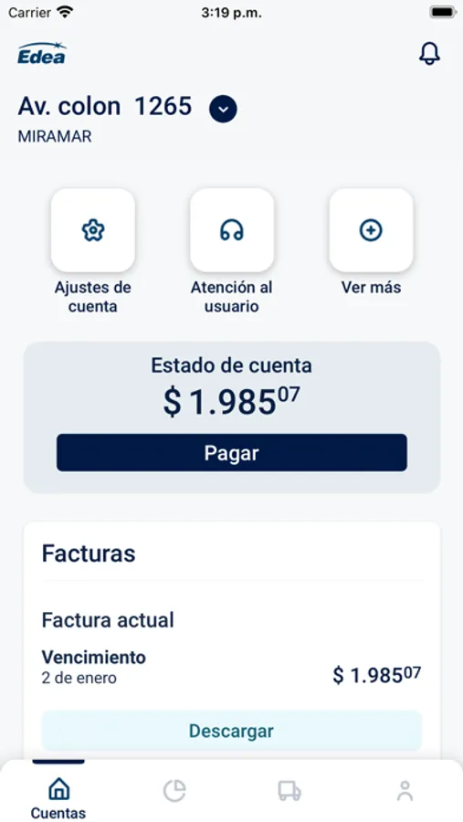 4. Factura: visualiza la fecha de vencimiento, el monto y la condición de pagas o impagas de las últimas doce facturas correspondientes a tu cuenta. En caso de registrar deuda, la aplicación te permite abonarla con tu tarjeta de crédito.