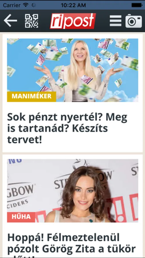 A Ripost.hu bulvárlap tartalmának kiterjesztése, jobban olvasható megjelenítése mellett az app lehetőséget ad arra is, hogy a felhasználó néhány mozdulattal fotókat, videókat küldjön rövid szöveg kíséretében a szerkesztőségnek. Ezzel lehetőség nyílik a később játékokban való részvételre, a ripost.hu honlapon a jövőben közzétett és az első indításkor az app által is jelzett feltételek alapján. Ha Ön sztárt lát, kapja elő a telefonját, és egy pillanat alatt küldje el nekünk a fotót vagy videót, amit készített! Legyen a munkatársunk!