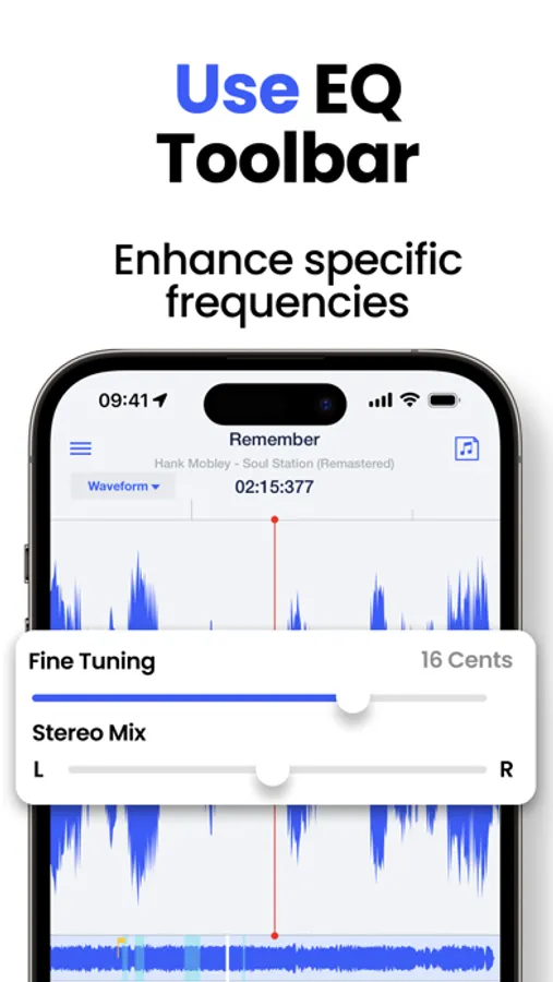 Further isolate or enhance the part you're listening to with the EQ toolbar or the Stereo Channel mixer. You can also finely adjust the overall pitch of the track in increments of 1 cent.
