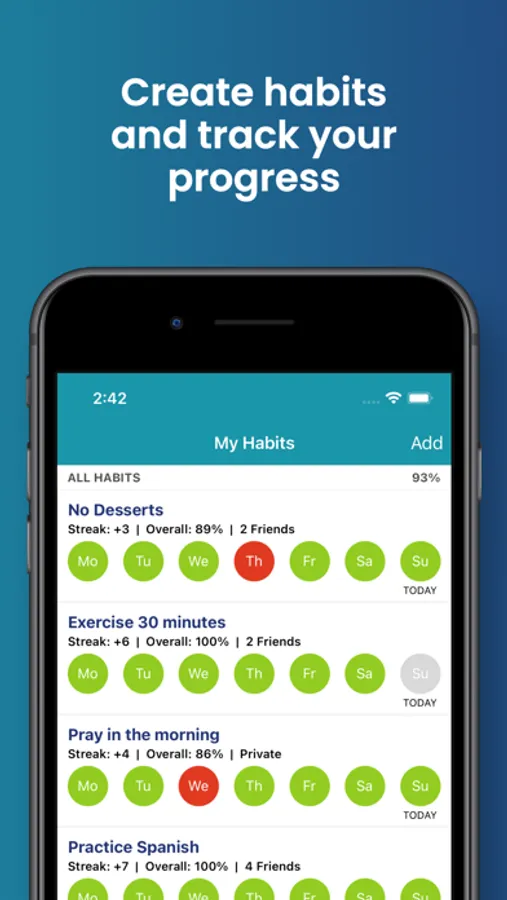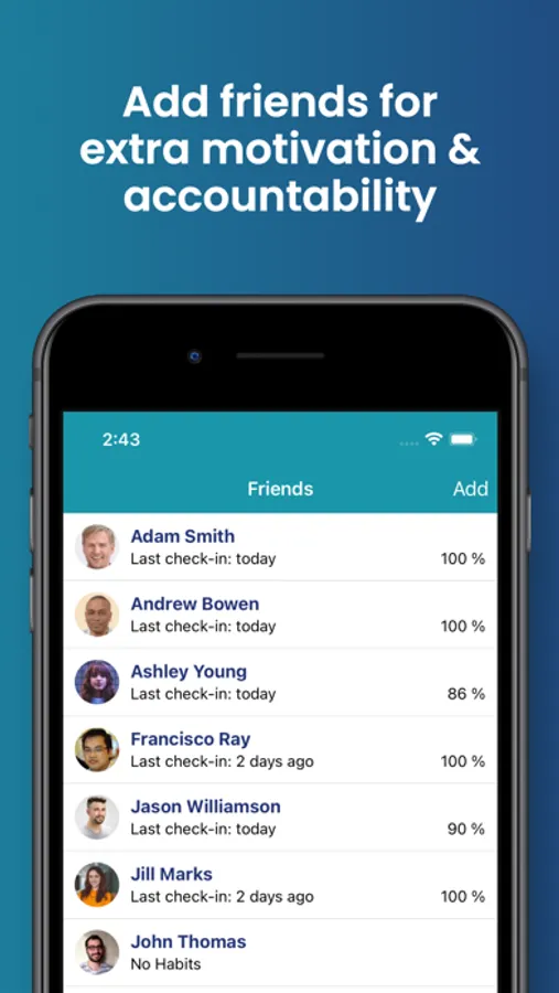 You can use HabitShare alone, but it works best when you add friends. With HabitShare, you have total control over privacy. Want to share your exercise habits with your running club and other habits with your family? No problem! You can even keep a habit 100% private.