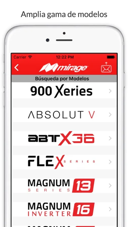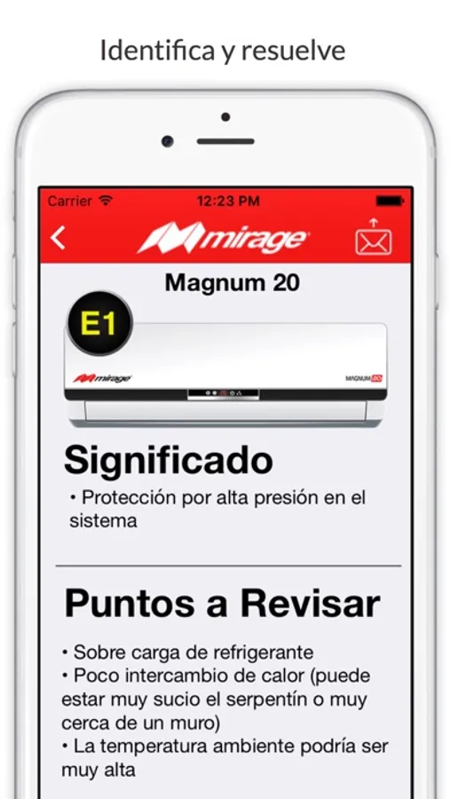 - Simplemente identifique su modelo dentro del listado de la gran gama de equipos mirage y el código que aparece, la aplicación lo guiará para mostrar el significado del mismo y la manera de resolverlo.