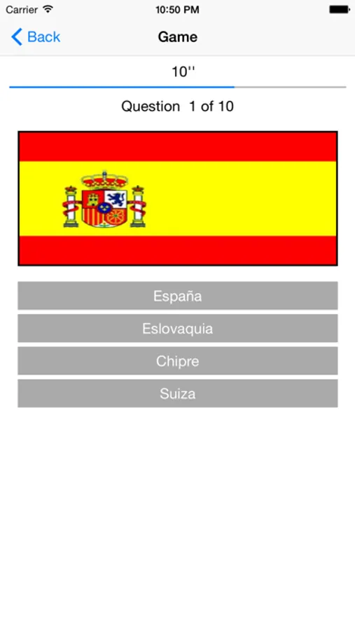 La app elige de forma aleatoria 10 banderas de los 50 países de Europa y te da cuatro opciones a elegir.