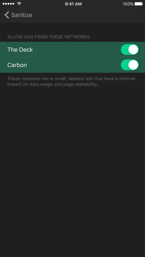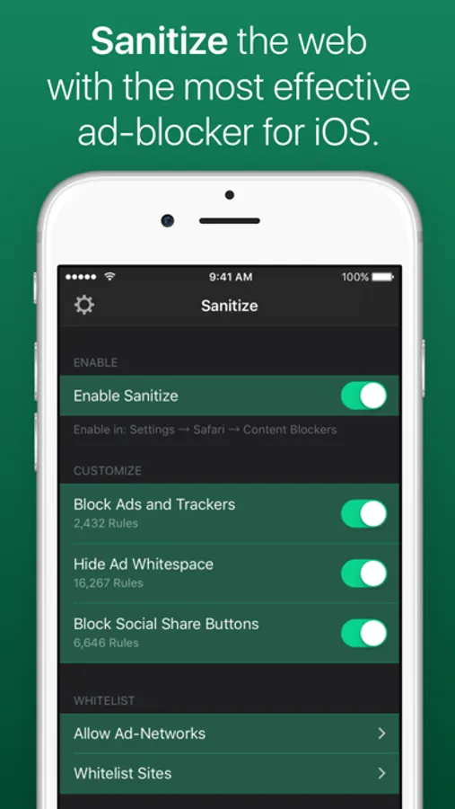 Sanitize is a powerful and efficient ad-blocker. It blocks ads, tracking scripts, social share buttons, pop-ups, and other annoyances from websites you visit. Sanitize makes your mobile browsing experience faster, and leaves you with more data at the end of the month.