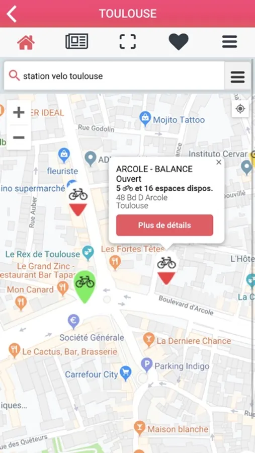 Retrouvez les services de la ville, tels que les stations Vélô Toulouse en temps réel, les toilettes publiques, ou encore les distributeurs de billets.