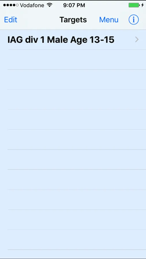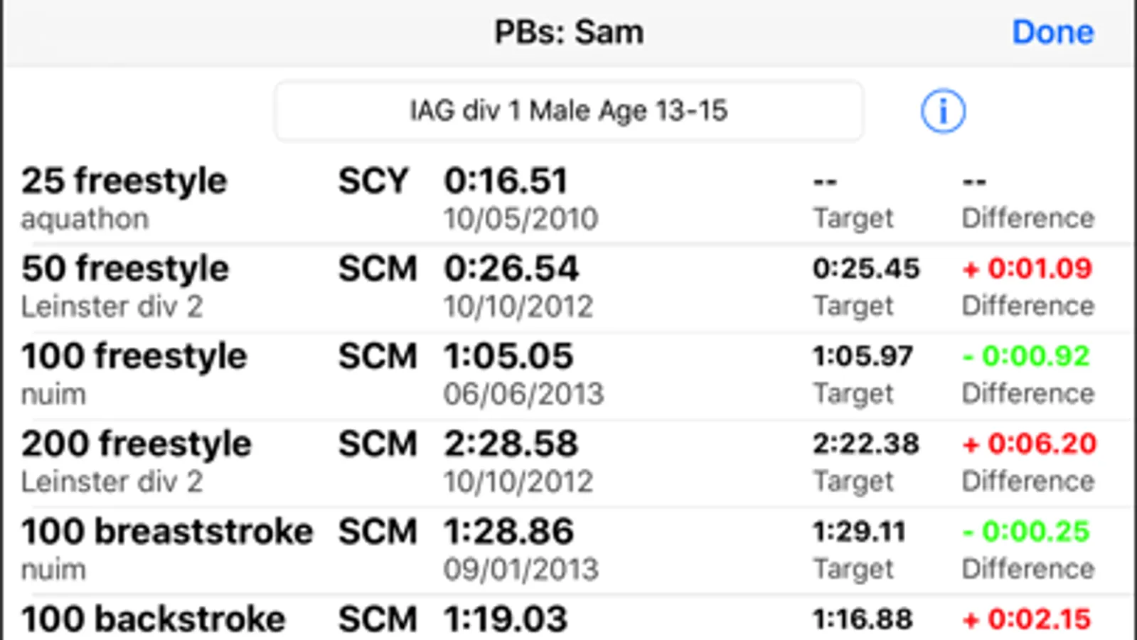 Targets can also be added (via the 'Swimmers' menu - 'Show Targets'). An example target might be 'IAG div 2 male age 12-13' which would contain the target times for all events for Irish Age Group, division 2, male ages 12-13. The required target for a swimmer would then be selected from a list in the 'Personal Best Times' view. For each event in the list, the relevant time would be shown from the target, along with the difference between the PB time and the required time for that event.