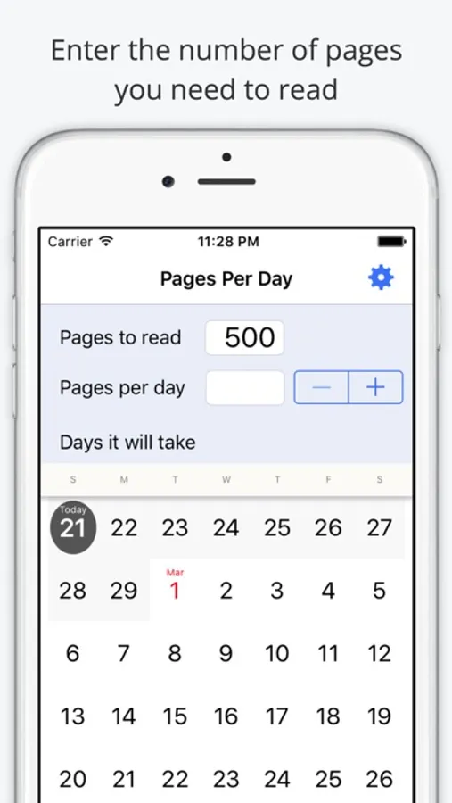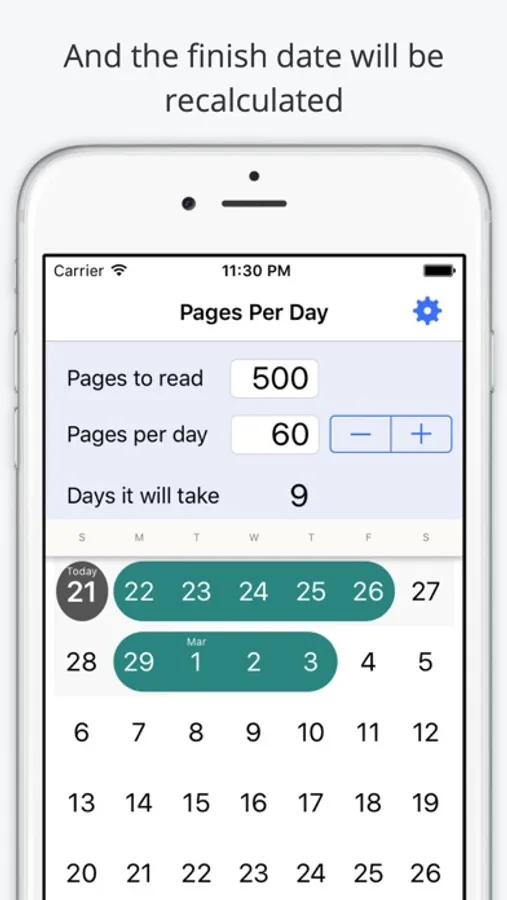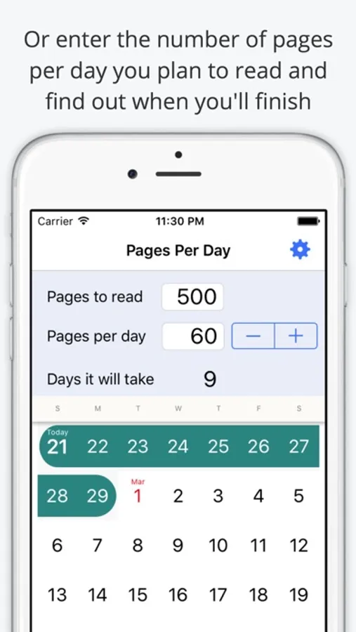 Simply enter how many pages you read per day and the calendar will show when you'll finish.