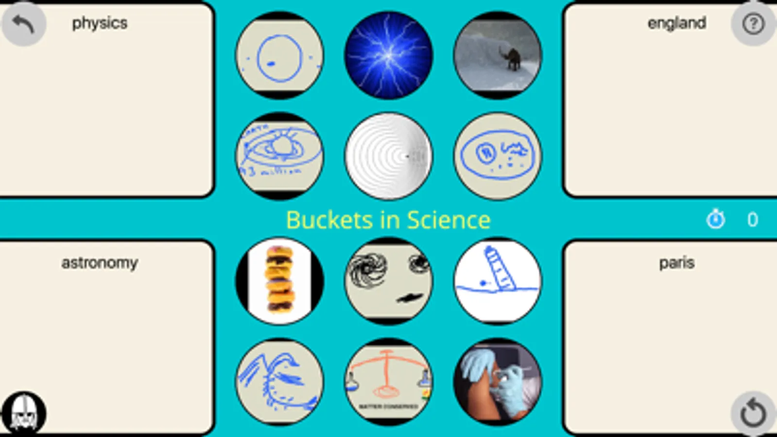 In Buckets, you have to sort 12 items into 4 categories. Try to make the largest category for the most points. Hints available, and 2 levels of play.