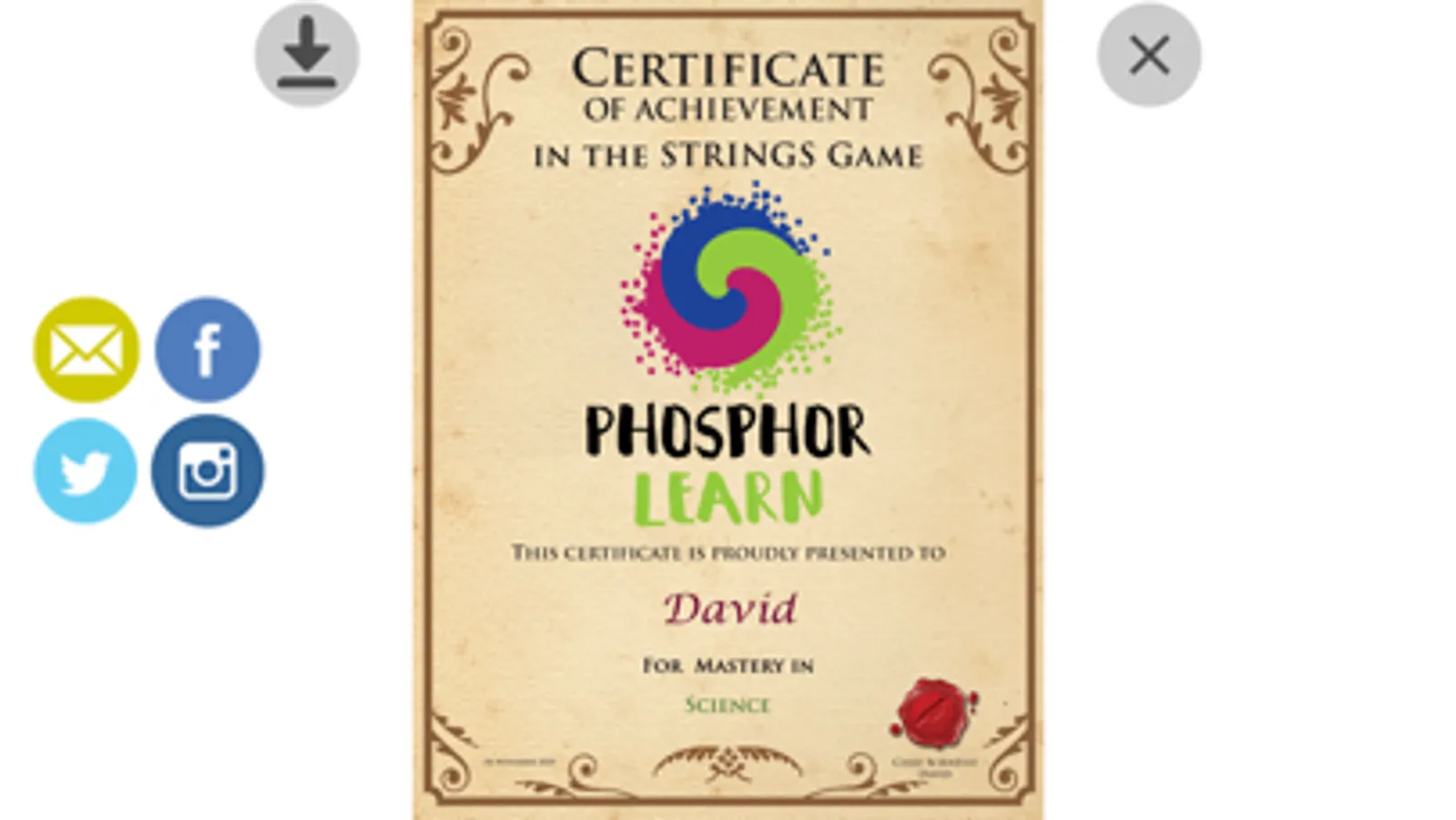 Shareable certificates of MASTERY are provided for high 5-game totals in Strings, Clues, Buckets.