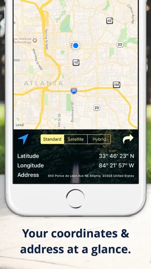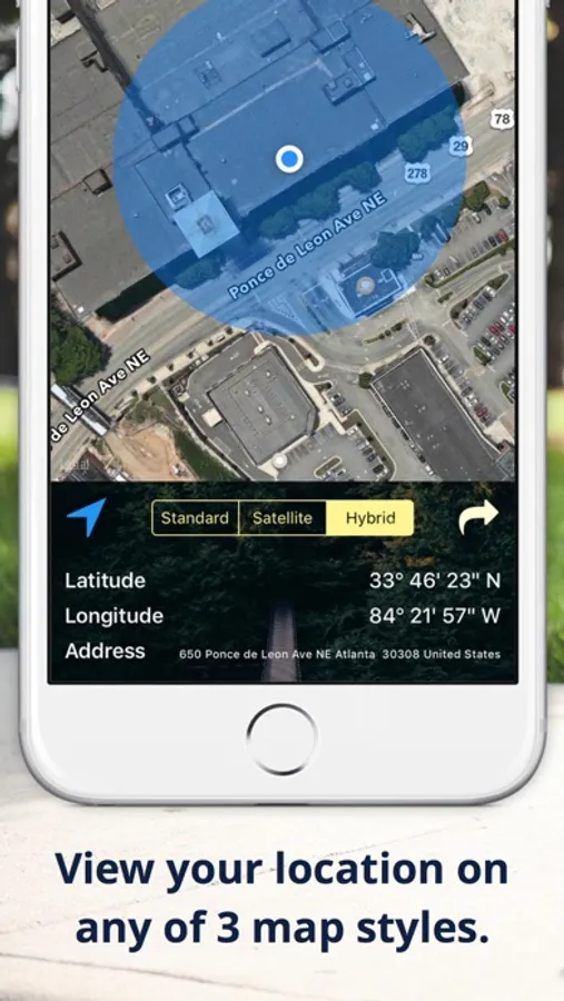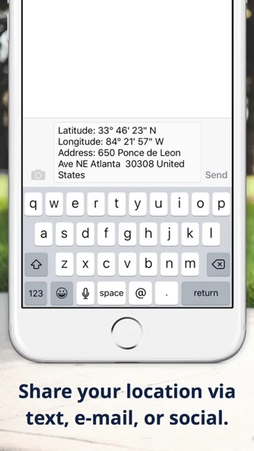 Send your location to friends or family via text, e-mail, or your social accounts. Just tap the light yellow arrow.