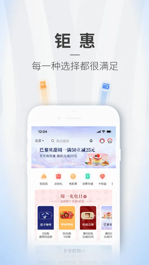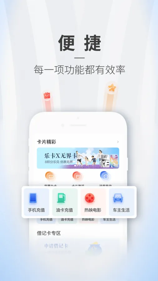 生活服务:贵宾礼遇、看电影、充值缴费、车主生活、出境购物;为您不断提供优惠便捷的生活服务。