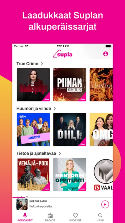 Rentoudu komedialla, jännitä true crimella, opi uutta ajankohtaisohjelmista tai uppoudu henkilökohtaisiin keskusteluihin. Suplasta löydät laadukkaat alkuperäissarjamme sekä suosituimmat suomenkieliset vapaan jakelun podcastit.