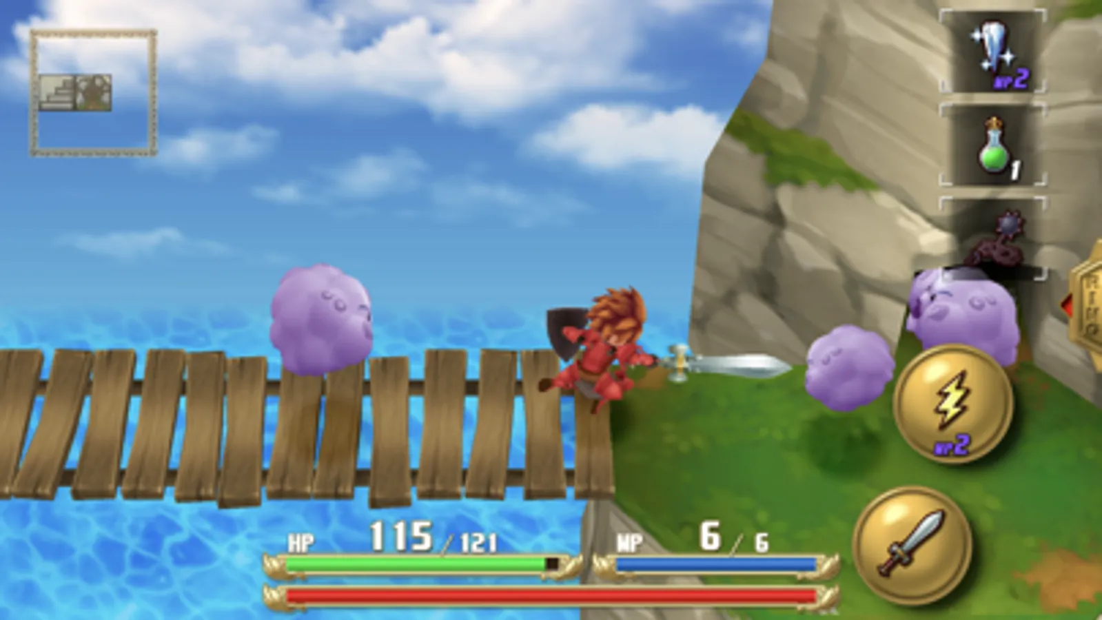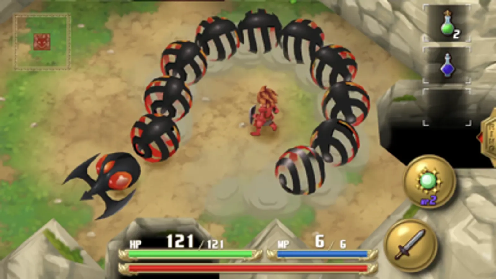 Player movement is achieved via a virtual joystick accessible anywhere on the screen. An auto-adjust feature has also been added so that even if your thumb strays from its original position, you will never lose control of the hero.