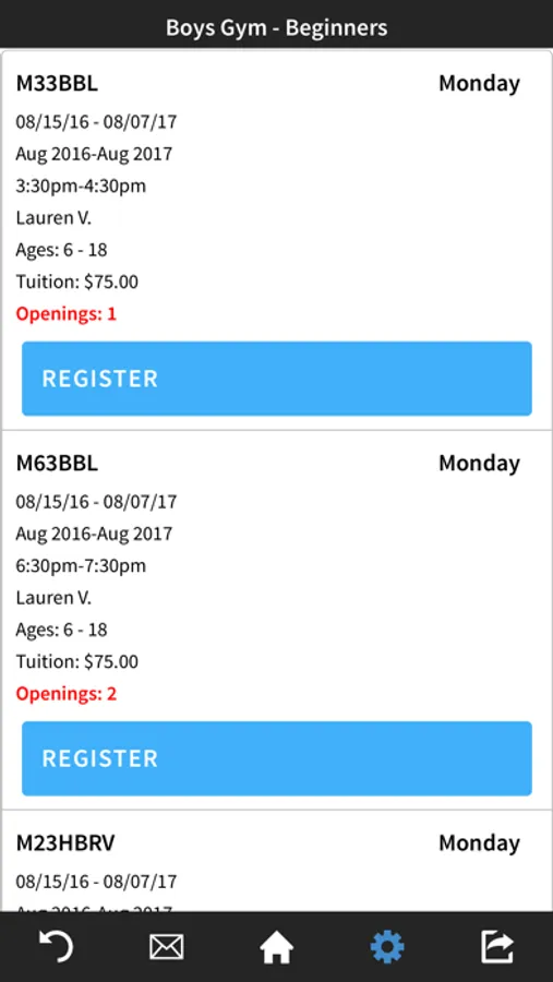 Class Schedule: -Have a class in mind? Search by program,age,day and time. You can register or put yourself on a waitlist. -Classes are live and always updated.