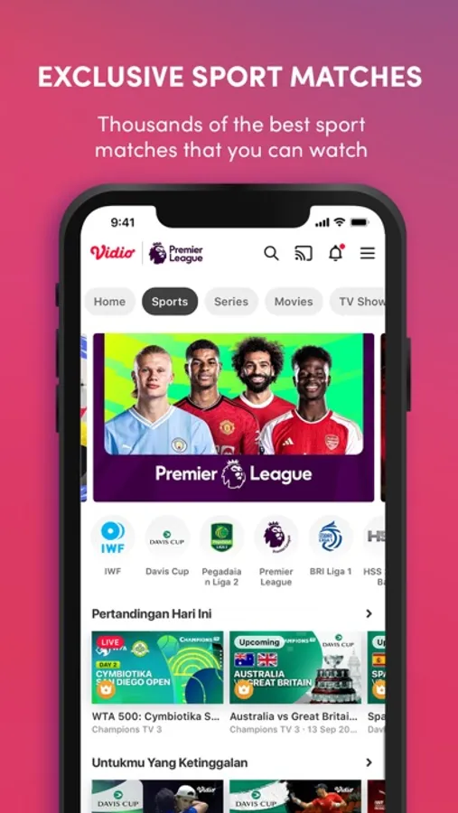 The most anticipated local and international sports: BRI Liga 1, Liga 2, Champions League, Europa League, AFC Asian Cup, BWF Thomas & Uber Cup, French Open, Denmark Open, NBA, and many more.