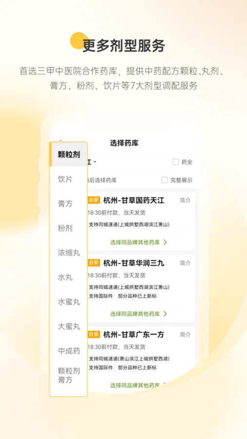提供饮片(含精制饮片)代配、代煎,膏方,粉剂,丸剂,中药配方颗粒等多剂型调配服务,支持胶囊灌装,茶包、足浴包、香囊、药枕制作,超细面膜打粉等特色延伸服务。