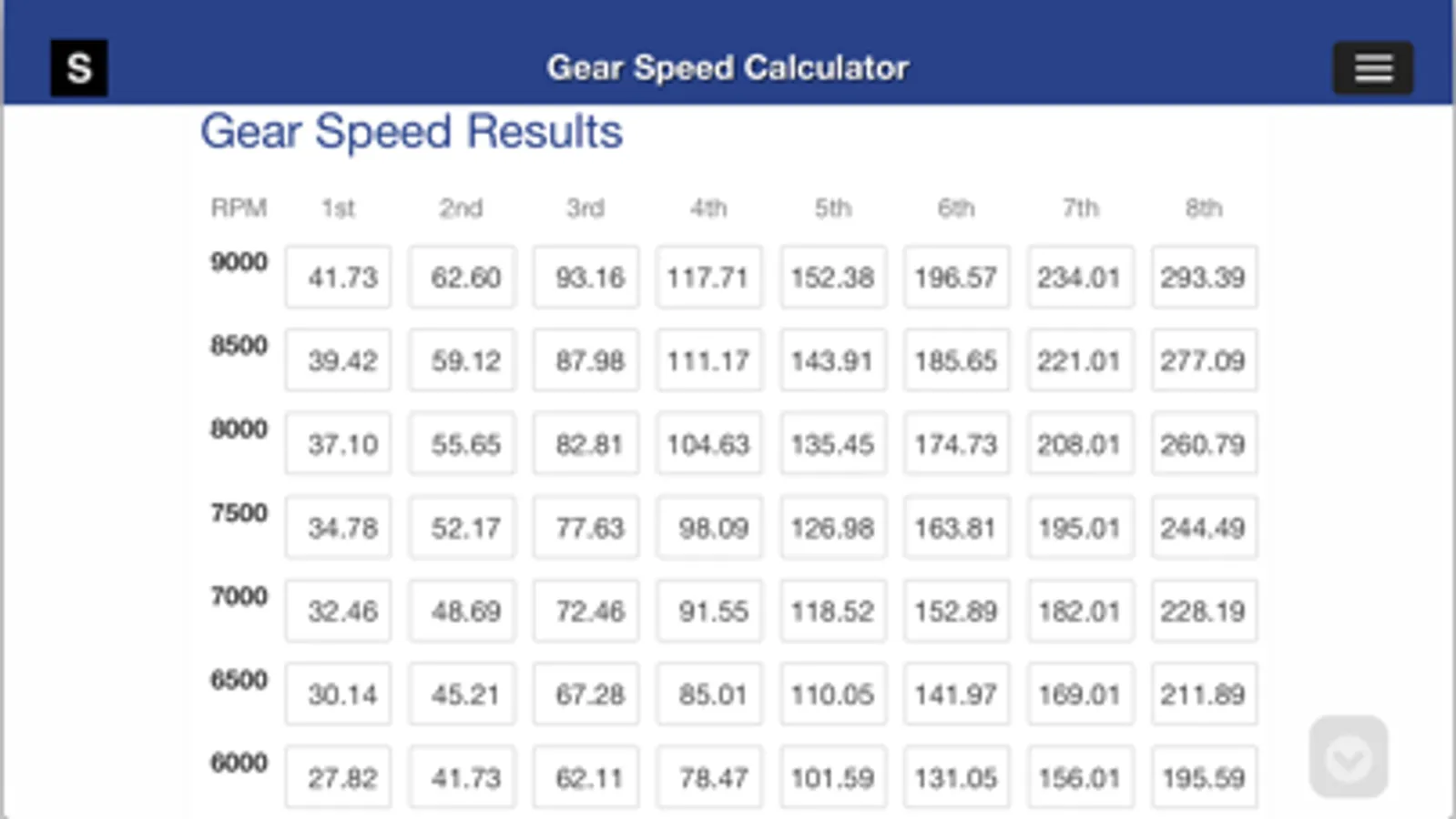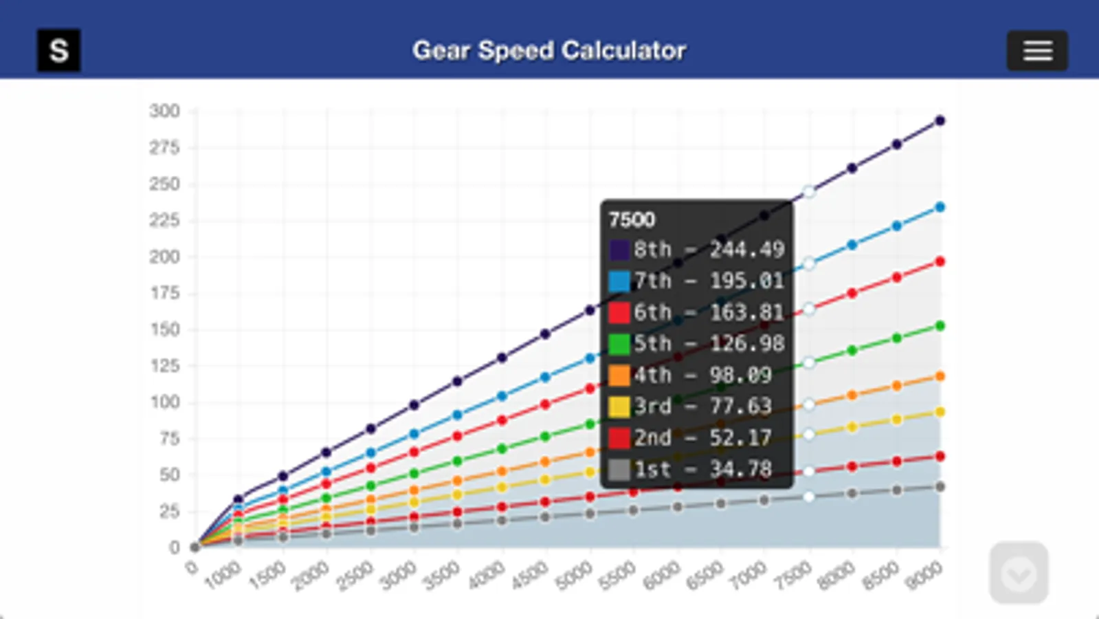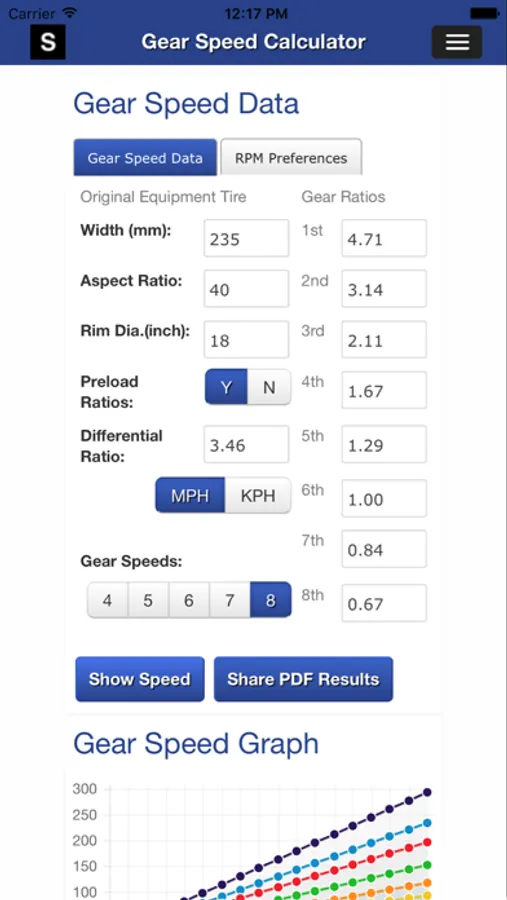 (1) Gear Speed Calculator - For calculating the speed in MPH or KPH for a given tire size, up to eight (8-speed) transmission gear ratios and differential ratio combination. The results appear in both an interactive Gear Speed Graph and Gear Speed Results Table (table not available for 3.5 inch display but does appear in the Share PDF Results feature). RPM Data Points are adjustable, allowing for further tailoring of the Gear Speed Graph and Results, to very specific RPM ranges, or to expanded the ranges beyond 9000 rpm.