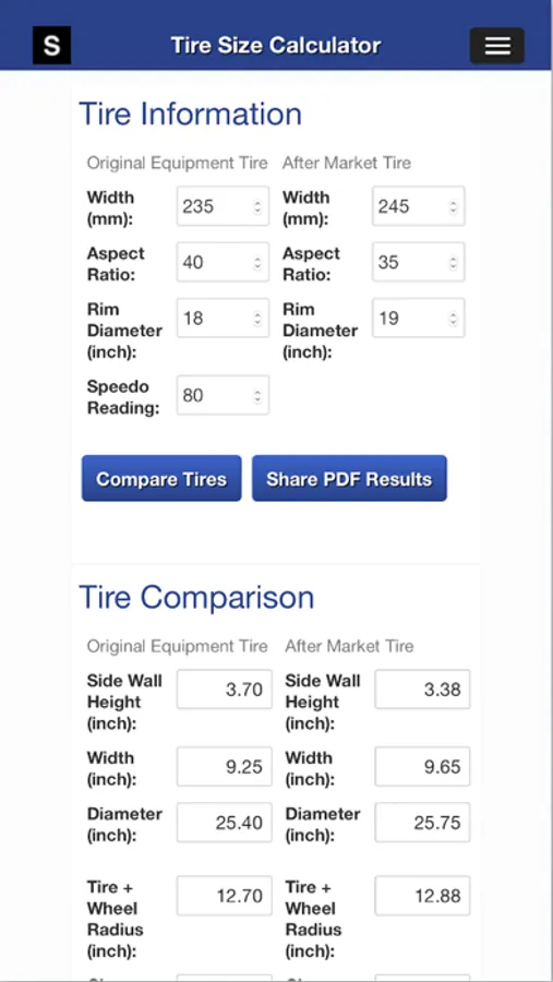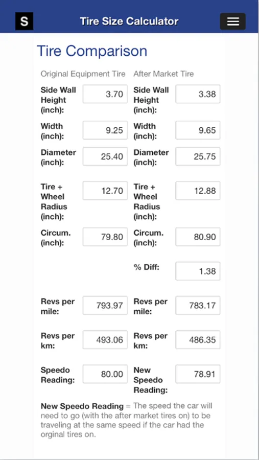 The Gear Speed and Tire Size Calculator app is for comparing different tire and wheel combinations to transmission gears and differential ratios. Preload gear ratios are provide and gear speeds 4-8 are selectable to tailor the output results to the transmission (4-speed, 5-speed, 6-speed, 7-speed, 8-speed).