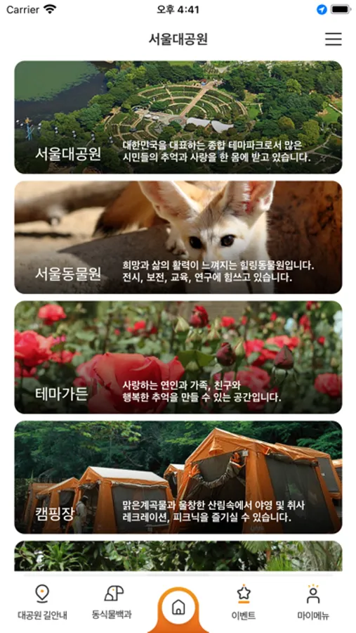 - 테마가든 : 테마가든 내 위치한 장미원과 어린이동물원의 다양한 동물정보를 테마지도를 보며 안내받을 수 있는 서비스