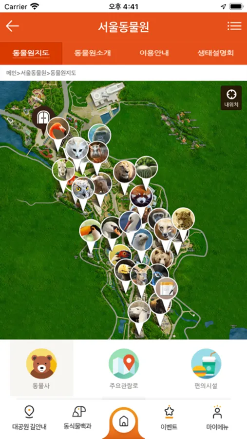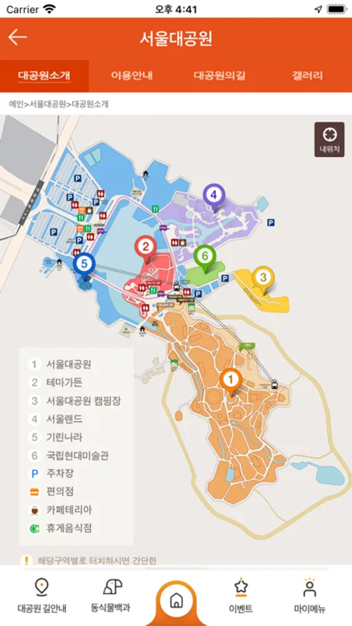 - 서울대공원 : 서울대공원 내 편의시설 및 주차시설, 공원내 이동수단 등의 이용안내 정보를 테마지도를 보며 안내 받을 수 있는 서비스