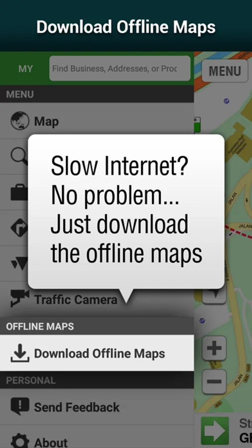 Once you download the offline map, you can use the map without internet connection and move around in Klang Valley (KL, Selangor, PJ, Putra Jaya) and nearby towns.