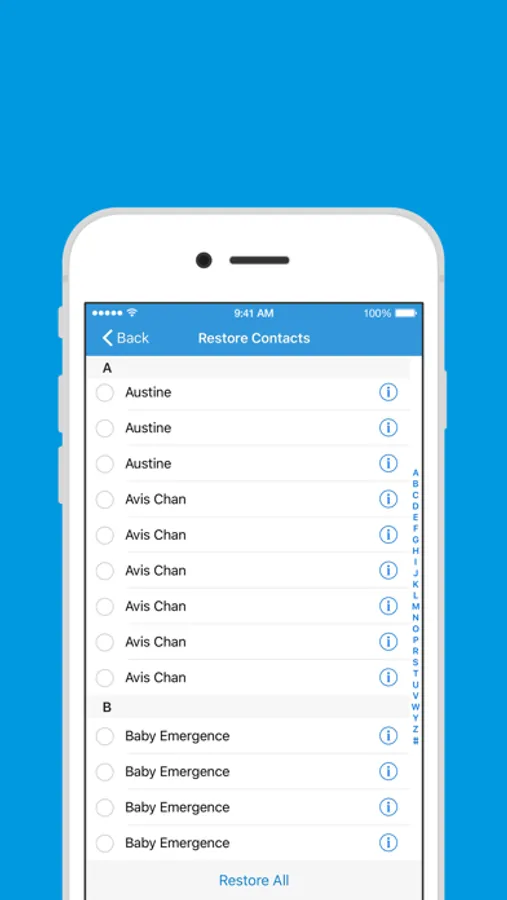 RECOVER provides the easiest way to back up and restore your contacts on your iPhone. No need to upload the contacts to Cloud and don't worry contacts info being used or leakage.