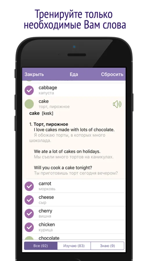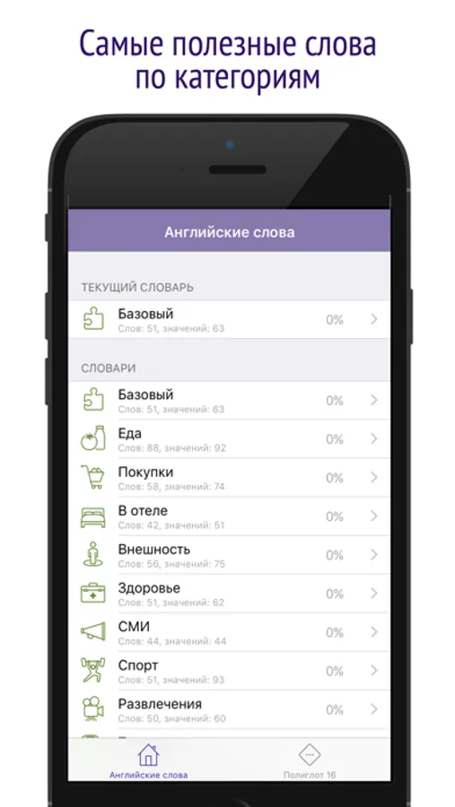 Все слова разделены по категориям, в каждой категории можно отметить слова которые вы уже знаете и учить только необходимое.