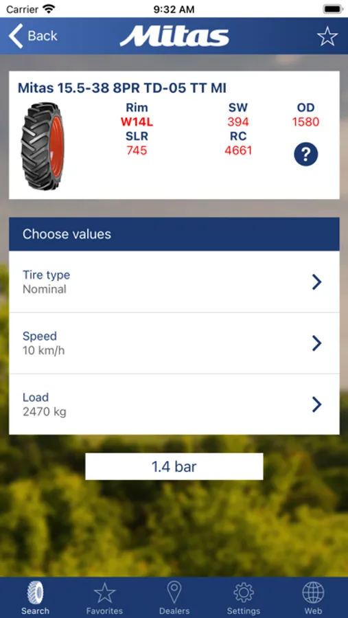 Just simply find your tyre in Mitas agricultural tyres database using fulltext search or filtering by tyre size. Then add your tyre to Favourites for an easy access to the right tyre pressure in different working conditions.