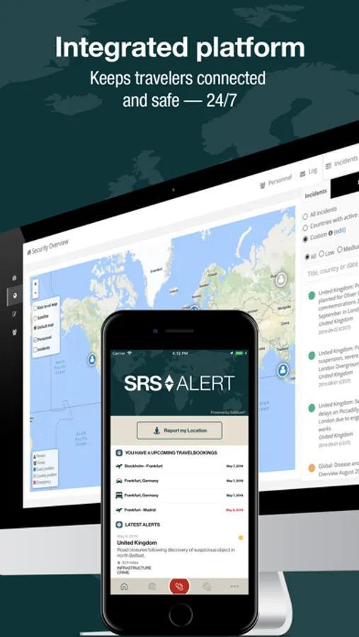 SRS ALERT keeps business travelers safe, wherever and whenever traveling abroad and connects corporate security teams directly with business travelers in real-time. SRS ALERT is the traveler's mobile interface to the SRS ALERT travel security platform.
