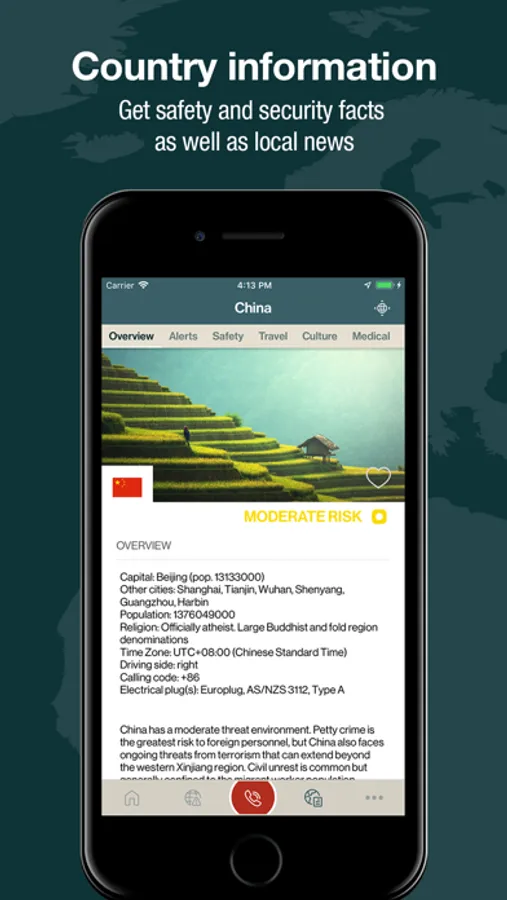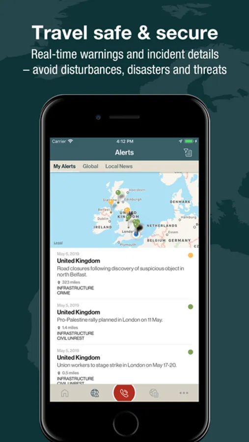 Receive push and SMS alerts to help you steer clear of trouble, such as extreme weather conditions and natural disasters, travel disruptions, political and civil unrest and terrorism threats.